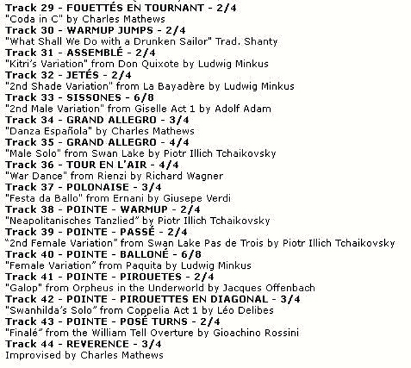 What a great collection of classical music with a little familiar and improvisational music sprinkled in. Charles Mathews has put together a complete ballet class that includes several selections for pointe work. The tracks for pointe go from warm-up to pirouette all in a perfect tempo. This CD starts and ends with a short reverence. What a beautiful way to conduct a ballet class.
