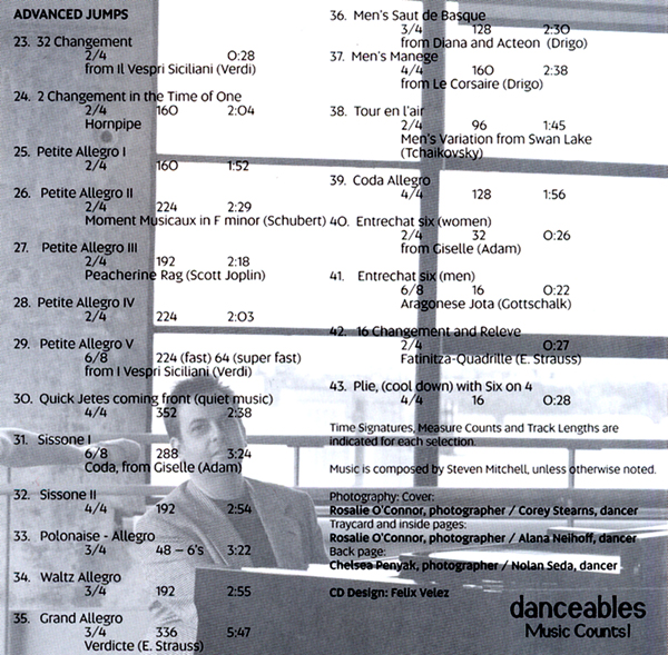 What a great idea!!! A CD devoted completely to jumps. All the music for any jump is included in these 43 different tracks. The music is divided into beginner, intermediate and advanced and can be used for more than just jumps. Each selection starts with a clear introduction so the dancers know when to jump and when to land. Some of the more advanced tracks will change tempo in the middle of a piece so the same steps can be done faster with out stopping. What a perfect way to make your dancers more versatile. |
