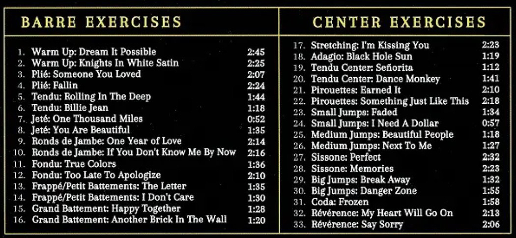 POP ROCK BALLET says it all. This title contains thirty-three of your favorite hits like ‘Nights in White Satin’ and ‘Billie Jean’ all solo piano arrangements created for a ballet class. Each selection contains the usual four-count introduction and an even number of measures for both the Barre and center work. Every exercise has at least two different tracks, making this title very easy to use. Just put it on and fit your class to the music knowing that the exercise will be repeated with a new tune when the first is finished. This CD contains lots of music for jumps and turns in the center with a grand finale to ‘Frozen’. Everyone will be inspired by this selection of melodies and Bruno’s wonderful playing. Contents |