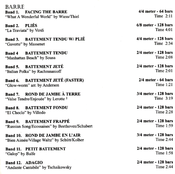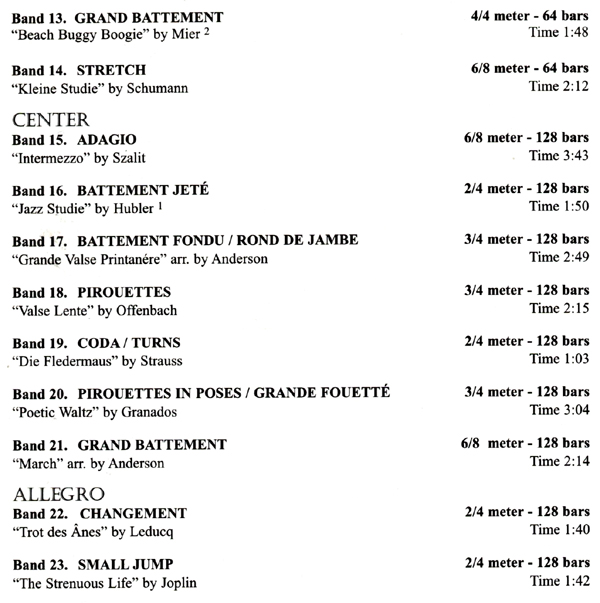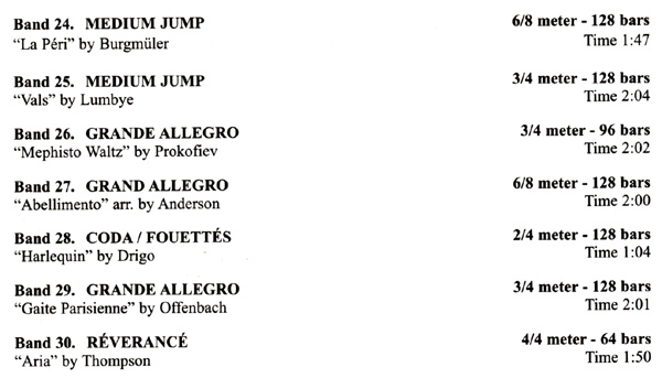 Master Class! Directed by Charles Flachs and performed by Susanne Anderson offers a collection of 30 different melodies arranged for a complete intermediate ballet class. This CD offers a wide range of music that spans from Joplin to Beethoven all perfectly arranged for an intermediate ballet class. The eight different allegro tracks make this master class challenging and something special. This music is easy to follow and there are several tracks for each exercise. CONTENTS