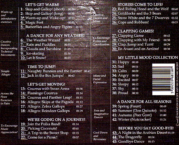Each piece has been specially composed with the youngest of dancers in mind, taking into careful consideration the style, tempo, and particularly the length of each track – crucial to the success of any exercise for this age group. This CD does not include music for specific technical exercises (plies, battements tendus etc…) but instead uses creative pieces to allow the teacher to ‘disguise’ these movements in a beautiful dance or through exciting role play exercises. We hope the Creative Dance and Mime section inspires and excites our future generation of young dancers! |